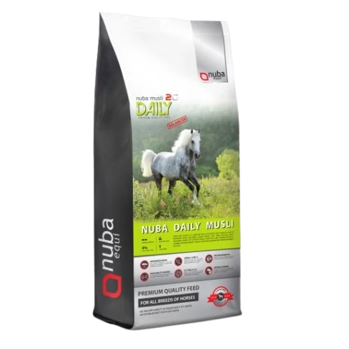 Nuba Daily Musli Balancer 2G to wysokiej jakości pasza dla koni sportowych, rekreacyjnych i zaprzęgowych, które potrzebują średniego poziomu energii. Jest to doskonała alternatywa dla owsa – bardziej zbilansowana, lepiej przyswajalna i bogatsza w niezbędne witaminy, minerały oraz kwasy tłuszczowe. Dzięki formie musli, pasza jest wyjątkowo smakowita i chętnie zjadana przez konie.