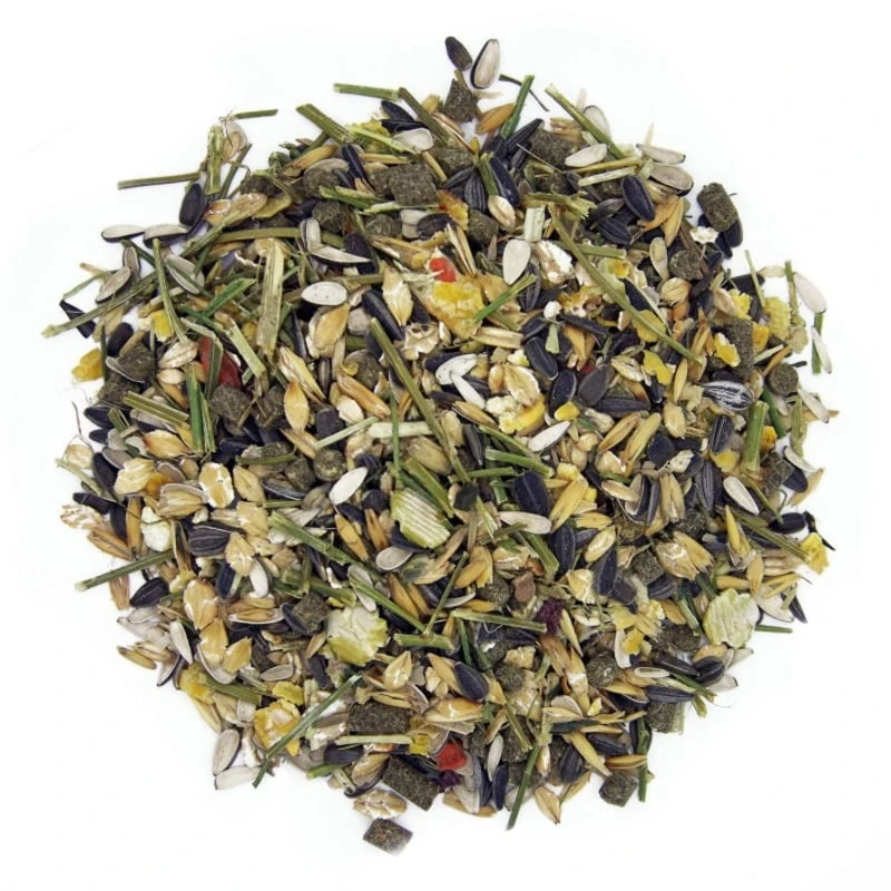 Skład: otręby ryżowe z zarodnikami, owies płatkowany, mączka z lucerny, jęczmień płatkowany, łuska słonecznika, kukurydza płatkowana, otręby pszenne, siemię lniane, słonecznik ziarno, sieczka z lucerny, drożdże paszowe, mączka z suszonych traw, łuska i otręby owsiane, wysłodki buraczane (niemelasowane), soja płatkowana [GMO free], łuska sojowa, groch płatkowany, wytłoki z czarnej porzeczki, mięta pieprzowa, olej lniany, węglan wapnia, chlorek sodu, tlenek magnezu, marchew suszona, burak suszony, MSM, aminokwasowy chelat cynku, wit. E, lizyna, wit. C, aminokwasowy chelat miedzi, algi morskie, aminokwasowy chelat selenu, beta-karoten (wit. A), probiotyk Biogen, wit. D3.
