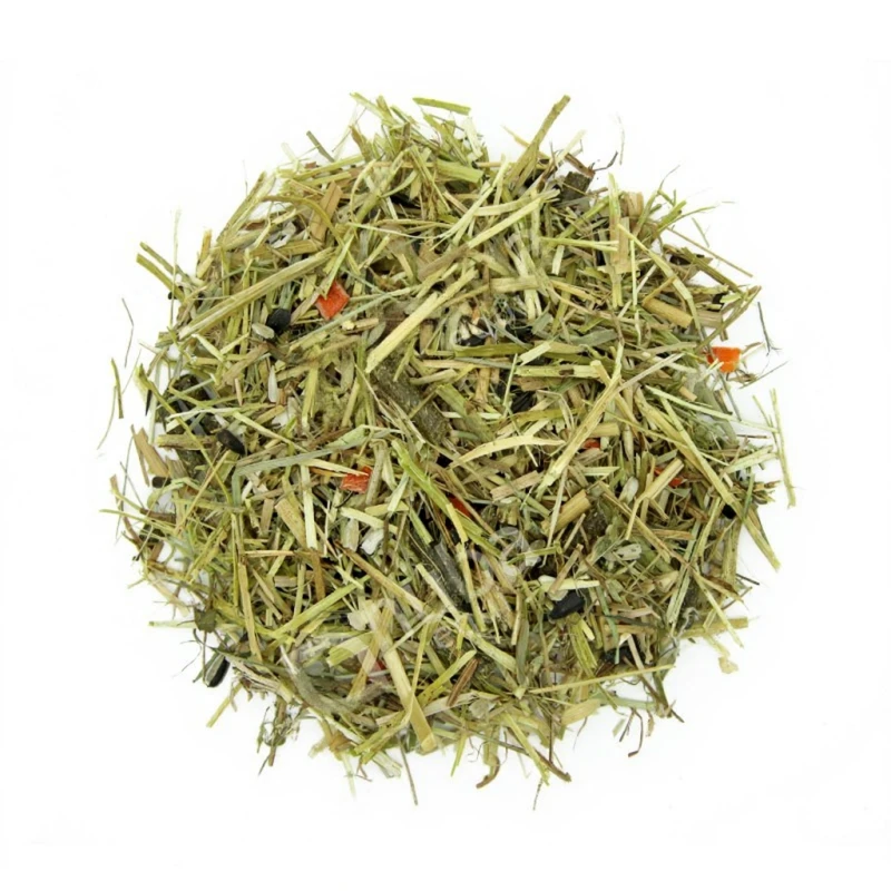 Lucerna sieczka, lucerna granulat, sieczka z traw, słoma owsiana, drożdże paszowe, siemię lniane, łuska słonecznika, olej lniany, słonecznik ziarno, marchew suszona płatkowana, algi morskie, aminokwasowy chelat cynku, MSM, tlenek magnezu, metionina, aminokwasowy chelat miedzi, witaminy, biotyna, selen, probiotyk.