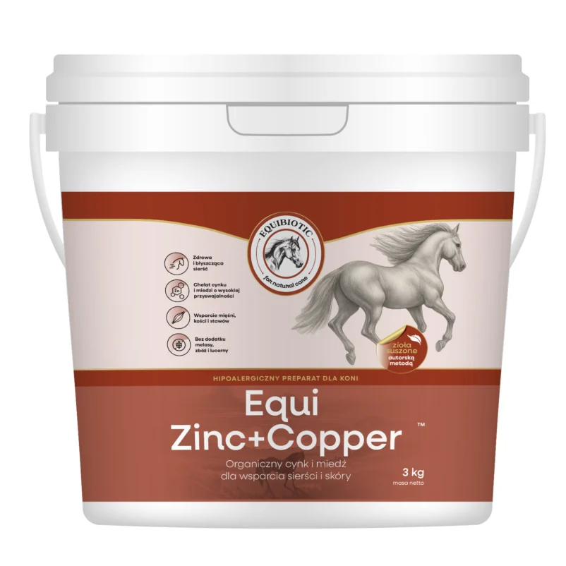 Equi Zinc+Copper™ to specjalistyczny, hipoalergiczny suplement mineralny dla koni, zawierający organiczne formy cynku i miedzi w optymalnym stosunku 3:1, zapewniającym maksymalną przyswajalność i bezpieczeństwo suplementacji. Zastosowanie chelatów aminokwasowych gwarantuje wysoką biodostępność pierwiastków oraz ich skuteczne wykorzystanie biologiczne.