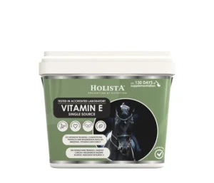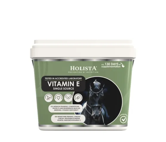 HolistaEquine Vitamin E Single Source to specjalistyczny dodatek dietetyczny w formie doskonale przyswajalnej witaminy E, opracowany z myślą o koniach i kucach w okresie zwiększonego zapotrzebowania lub niedoborów tego kluczowego antyoksydantu. Preparat wspiera profilaktykę zdrowia, chroni komórki przed stresem oksydacyjnym oraz poprawia kondycję koni sportowych i hodowlanych.