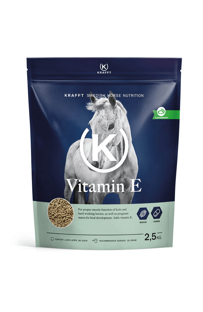 KRAFFT Vitamin E to wysokokoncentrowany suplement witaminy E dla koni, opracowany w celu wsparcia pracy mięśni, regeneracji po wysiłku oraz ochrony organizmu przed stresem oksydacyjnym. Preparat jest szczególnie polecany dla koni sportowych, źrebiąt oraz klaczy hodowlanych, które wymagają zwiększonego wsparcia metabolicznego.