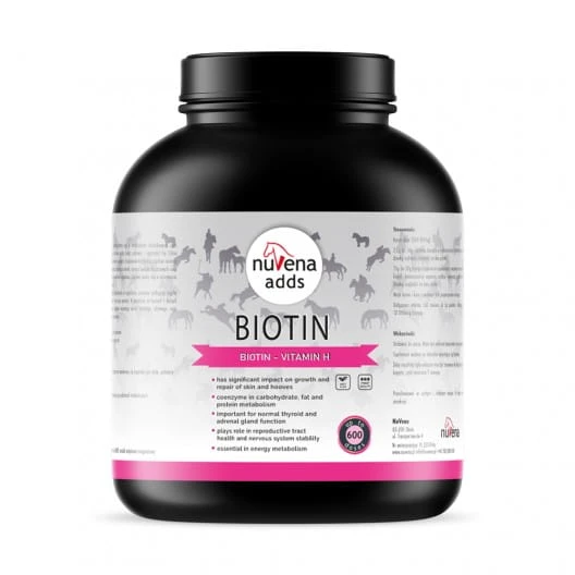 NuVena Biotin to czysta biotyna dla koni na nośniku, bez dodatków. Biotyna, nazywana również witaminą H lub B7, pełni kluczową rolę w metabolizmie energetycznym, syntezie kwasów tłuszczowych i aminokwasów oraz we wzroście komórek. U koni jest szczególnie ceniona za swój wpływ na kondycję skóry, sierści i kopyt – wspiera odbudowę rogu kopytowego, poprawia jego jakość i przyspiesza wzrost.