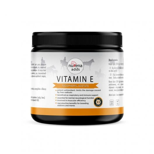 NuVena Vitamin E to czysta witamina E bez dodatków, w formie octanu tokoferylu. Jest jednym z najważniejszych antyoksydantów, chroni komórki przed stresem oksydacyjnym i wspiera odporność, regenerację oraz pracę mięśni. Regularna podaż tej witaminy zapobiega zmęczeniu mięśni po treningu, wspiera układ sercowo-naczyniowy, poprawia kondycję skóry i wpływa na rozwój płodu u klaczy.