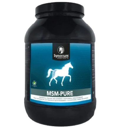 SYNOVIUM MSM PURE to czysty i skuteczny suplement wspierający zdrowie stawów, ścięgien i skóry koni, poprawiający regenerację oraz kondycję organizmu, idealny dla koni sportowych i wymagających dodatkowego wsparcia.