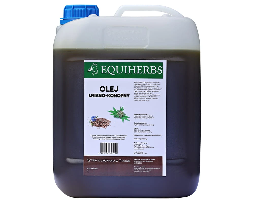 Olej lniano-konopny EQUIHERBS to wyjątkowa mieszanka 80% oleju lnianego i 20% oleju konopnego, tłoczonych na zimno i nierafinowanych. Połączenie tych dwóch składników łączy w sobie wszystkie zalety oleju lnianego – poprawa kondycji skóry, sierści i kopyt, regulacja procesów trawiennych i lepsze przyswajanie składników odżywczych – z właściwościami oleju konopnego, który działa uspokajająco, wspomaga równowagę nerwową i wzmacnia odporność.