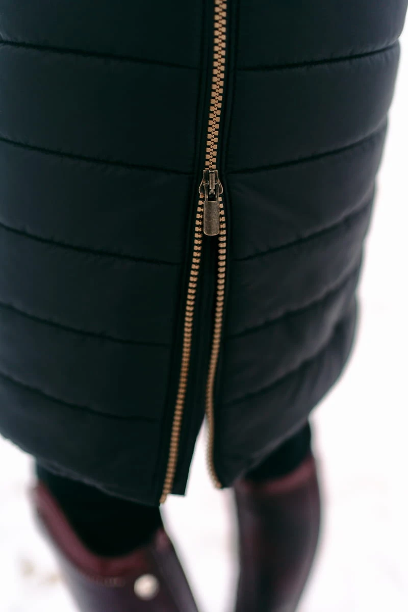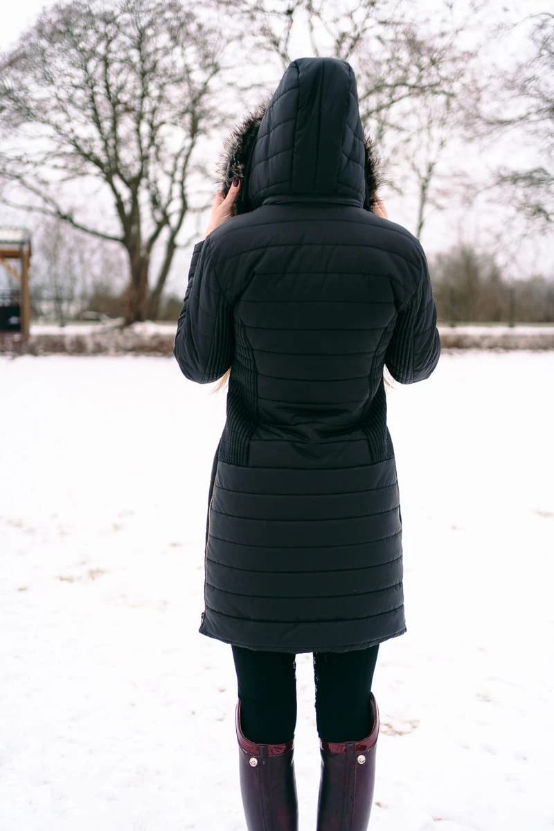 - Bardzo ciepły, zimowy płaszcz jeździecki wypełniony imitacją sztucznego puchu,