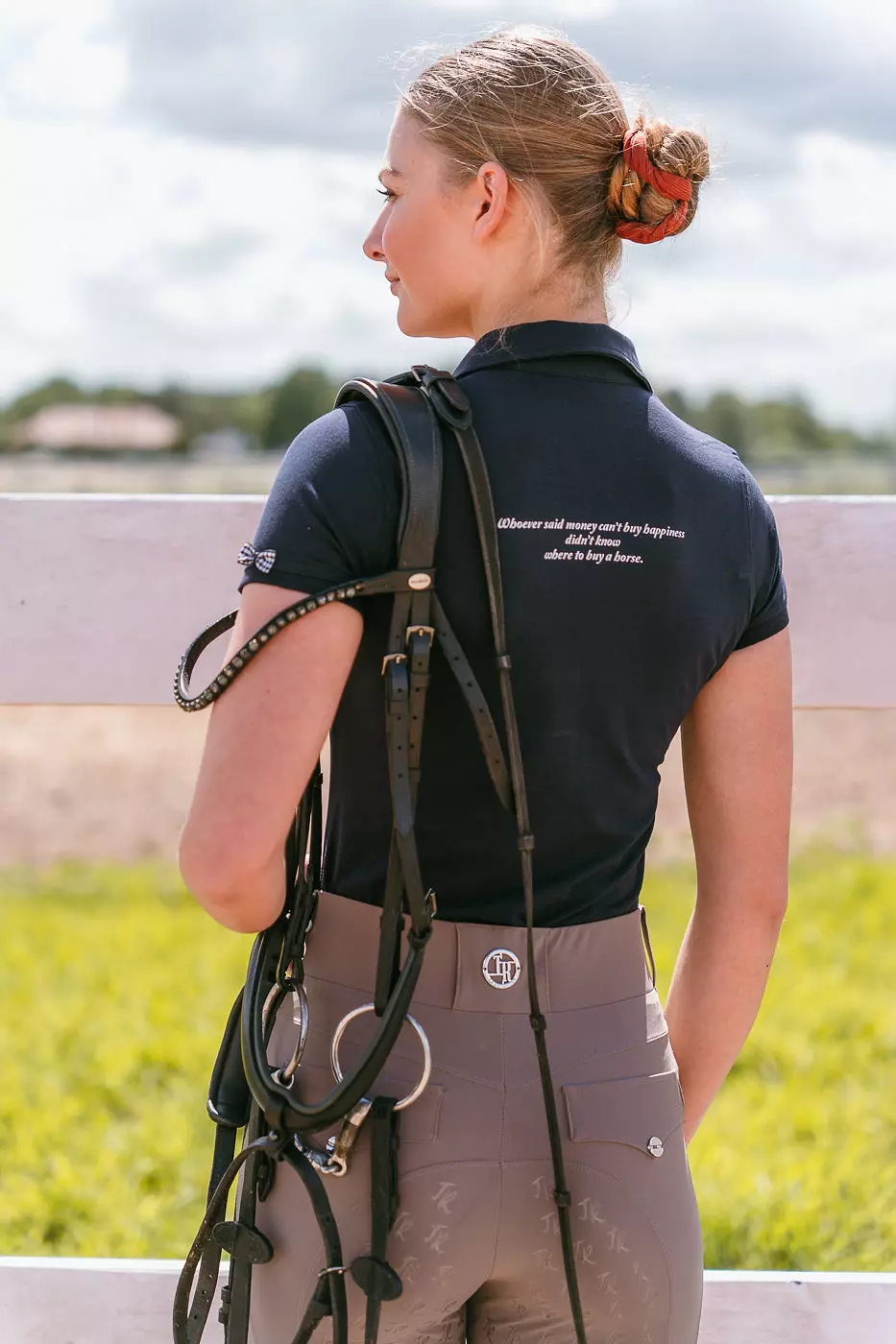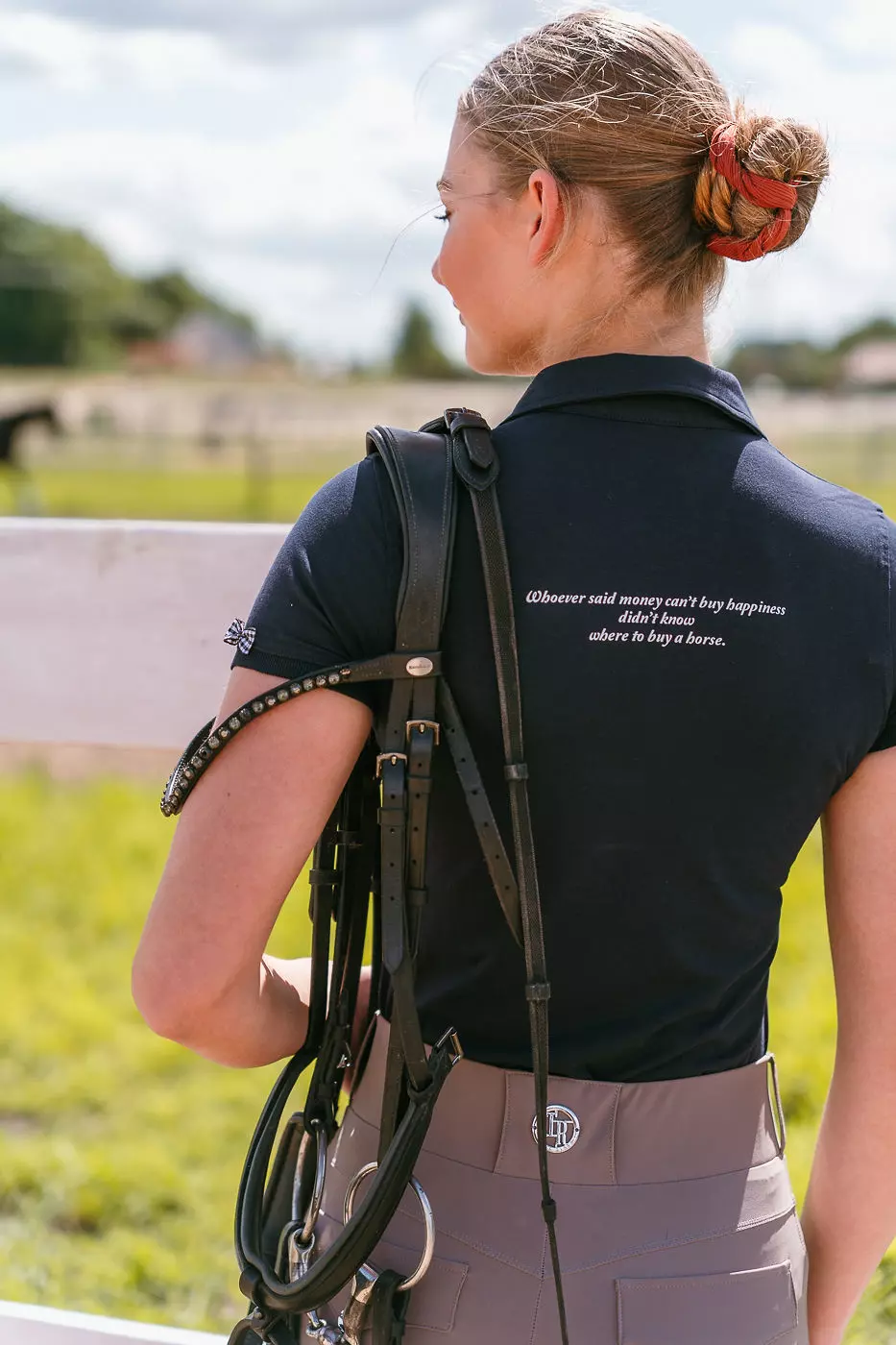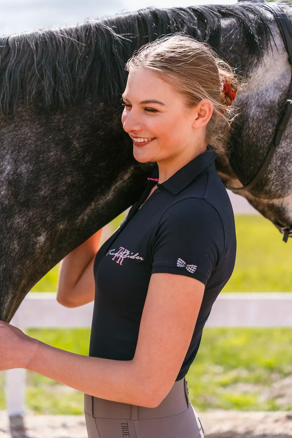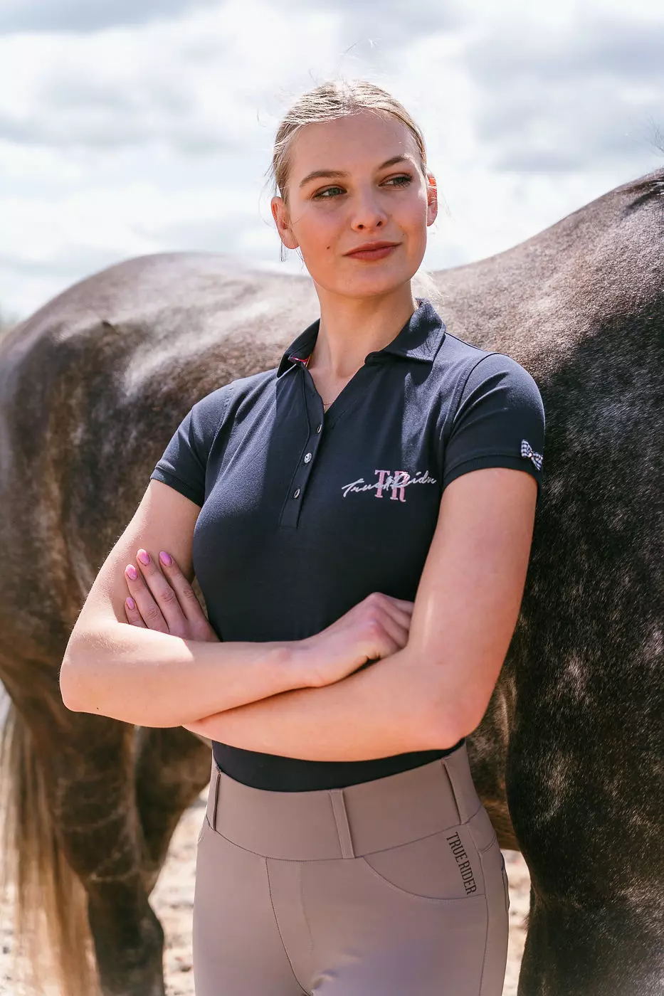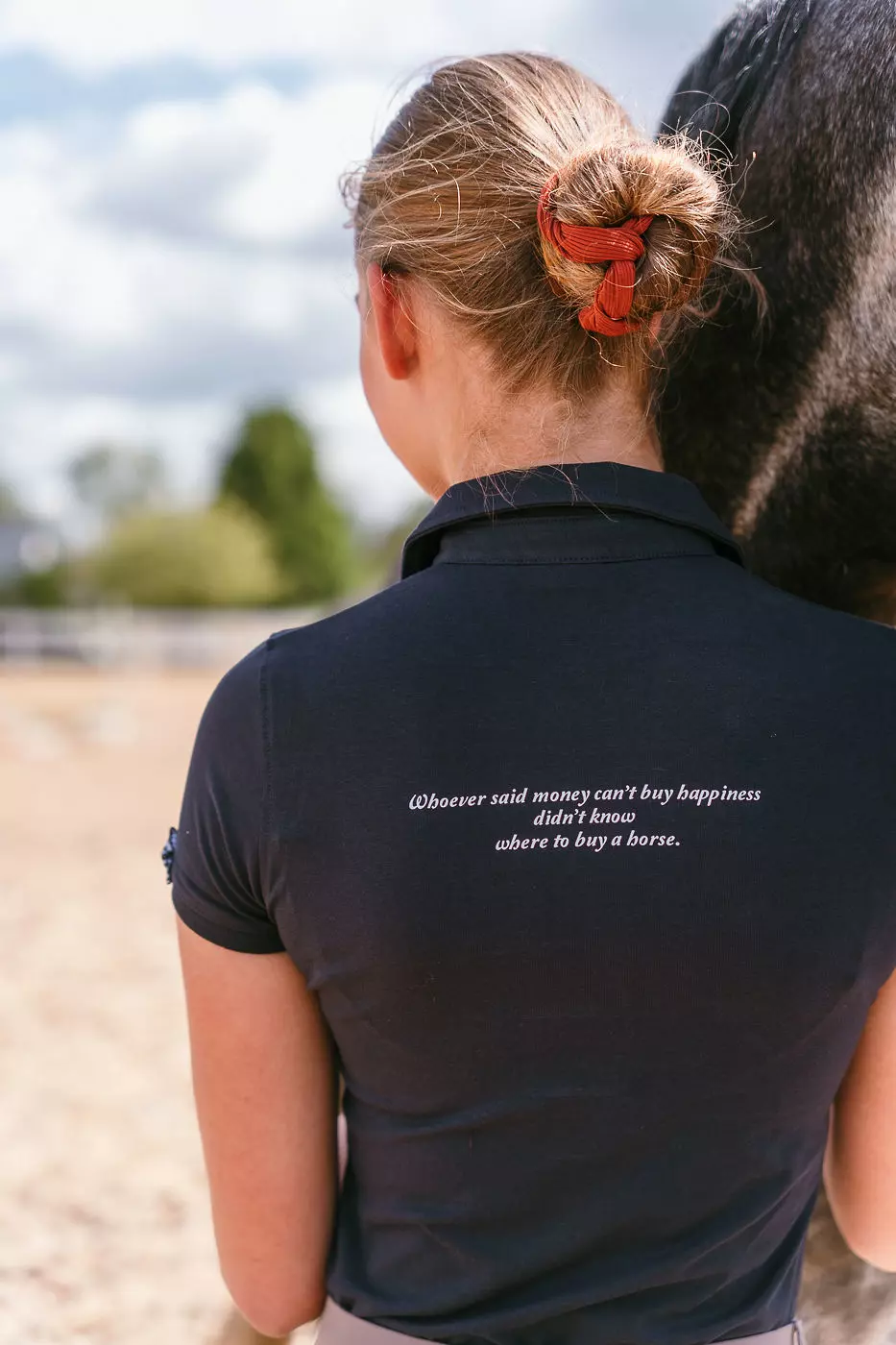 - Polo jest wykonane z wysokiej jakości bawełny (95%) i dodatku elastanu (5%) dzięki temu idealnie dopasowuje się do ciała, ale nie krępuje ruchów, a po treningu pozwala jeźdźcowi nadal odczuwać komfort.