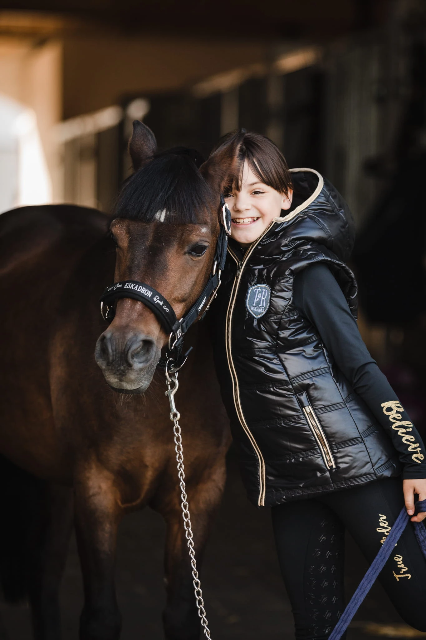 - Zapinany na zamek, wzdłuż którego dodaliśmy ozdobny kontrastowy nadruk True Rider. Nasz Thermo Golf Black & Gold to idealne uzupełnieni kolekcji Black & Gold w której znajdziecie kamizelkę, zimowe legginsy z pełnym lejem, czaprak, nauszniki raz derkę!