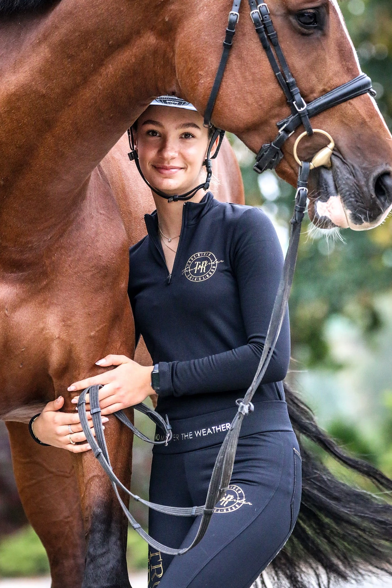- Wysokiej jakości materiał podszyty miłym w dotyku polarkiem - ciepły, ale jednocześnie odprowadzający wilgoć. Utrzymuje optymalną temperaturę ciała, zapobiegając przegrzaniu w trakcie wysiłku i przewianiu, kiedy stępujecie z koniem po treningu.